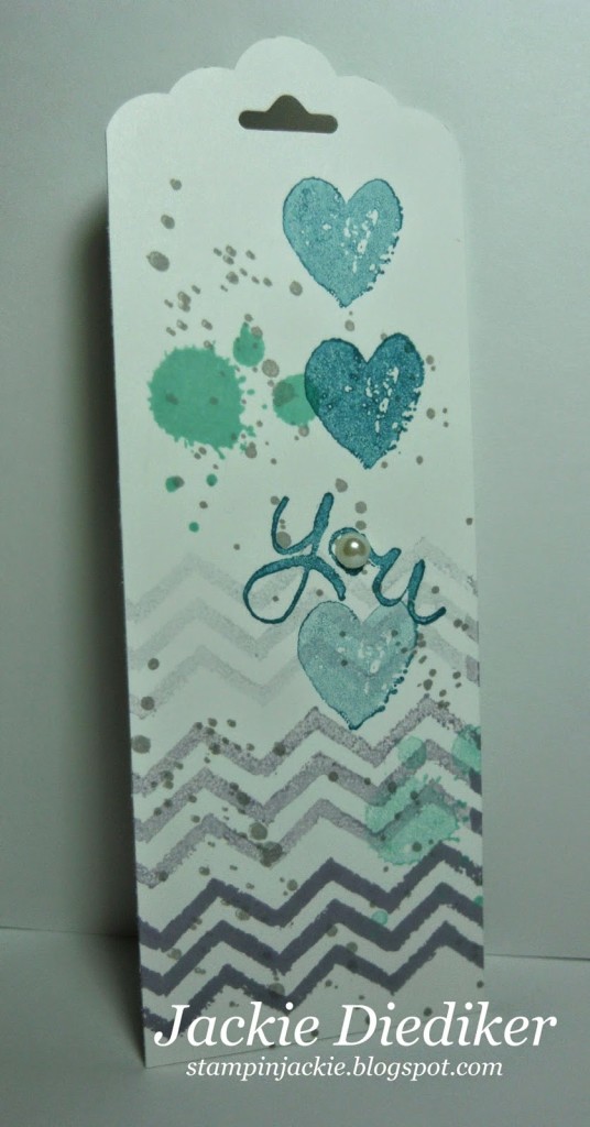 Monday we had our monthly demo meeting and we all brought our Work of Art stamp set. My upline Sherrie pulled out a bunch of ink pads and some cardstock and we got to work! We each made one card and one bookmark. Bookmarks are so easy when you use the Scalloped Tag Topper Punch! On the first card I used Strawberry Slush, Memento Tuxedo Black, and Basic Gray inks for my design. My intention was to create a flower with the sentiment in the center. I think it worked out well. My bookmark I used Basic Gray, Coastal Cabana, and Island Indigo ink on my Whisper White bookmark base.