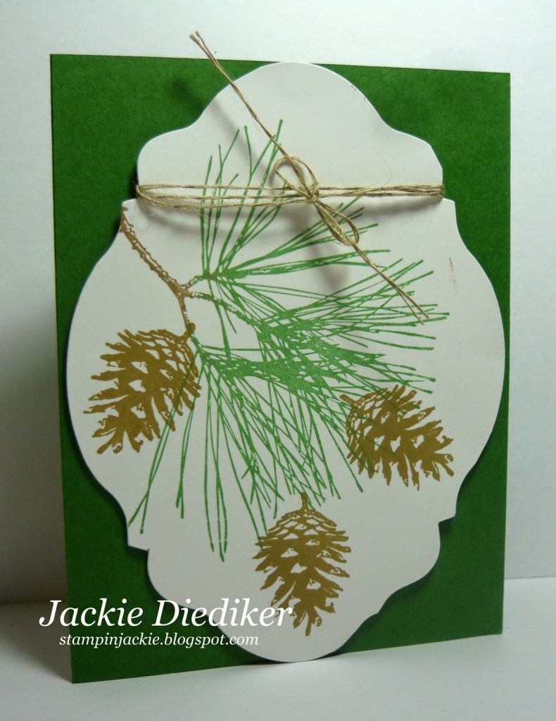 I wanted to create a card using the fabulous Ornamental Pine stamp set. I love this set, there is just a class to these images. I used Garden Green Cardstock and Ink plus Baked Brown Sugar Ink for this card and I really think that this works so well. I also used the fabulous Clear Oval Accent Bigz Die and a bit of Linen Thread to finish off this sweet holiday card. The best part is that this card could also work wonderfully for a winter card!