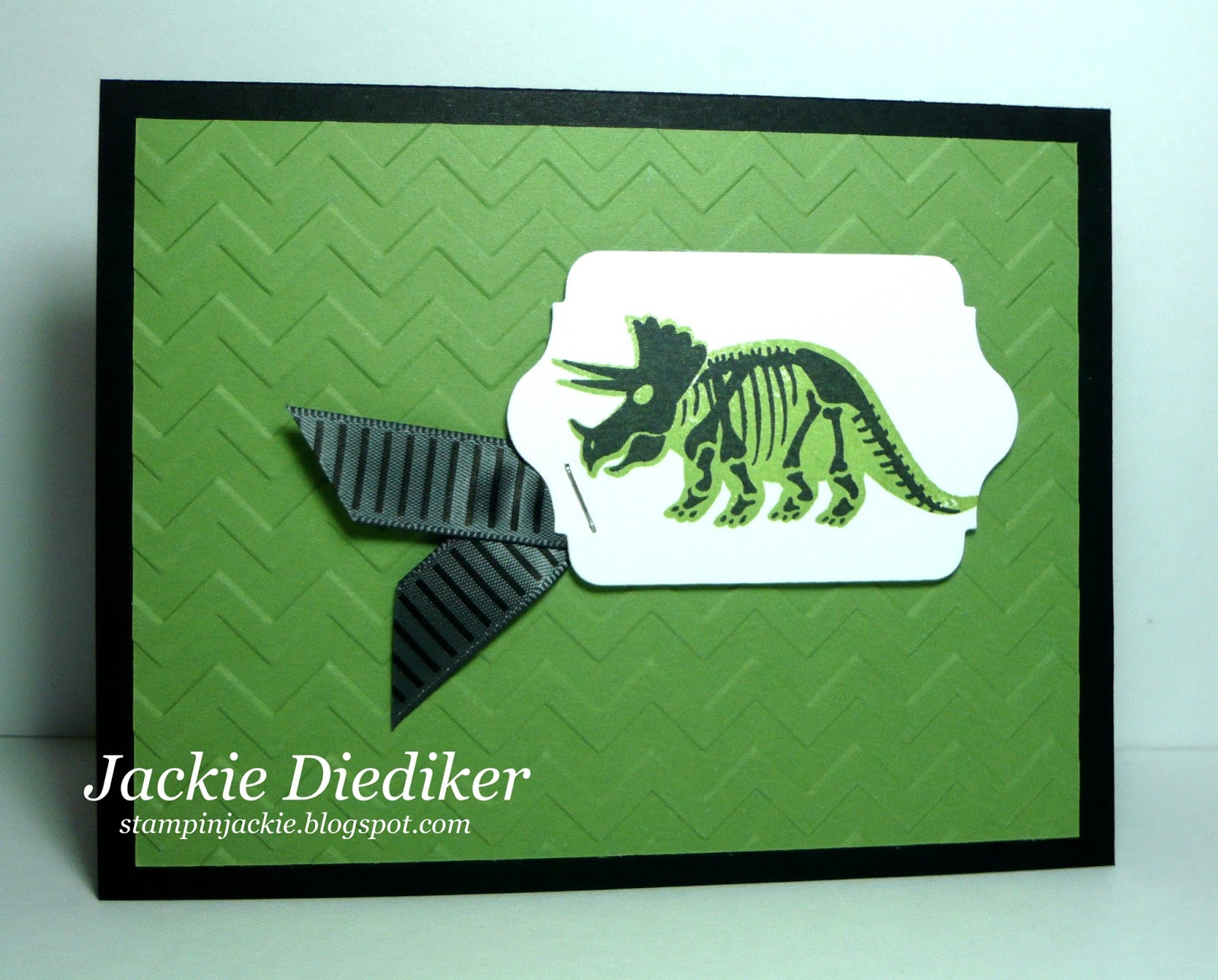 I had such a great time working with this sketch! I recently got this stamp set and this sketch was the perfect excuse to get this set inked up! The No Bones About It stamp set really caught my eye when I saw it added to the new catalog. I just had to have it! I decided on greens – Wild Wasabi and blacks for this Triceratops today, he just makes me smile! These stamps were so easy to line up and this stamp fits so nicely inside the Chalk Talk Framelie Dies. When trying to decide what to use as as accent I decided to pull out this retired ribbon that I ordered once from the Clearance Rack and shared with a friend. I have a decent amount of this ribbon left and I thought this card would be perfect together. This sketch just called out to me for this No Bones About It stamp set and I simply love the results!