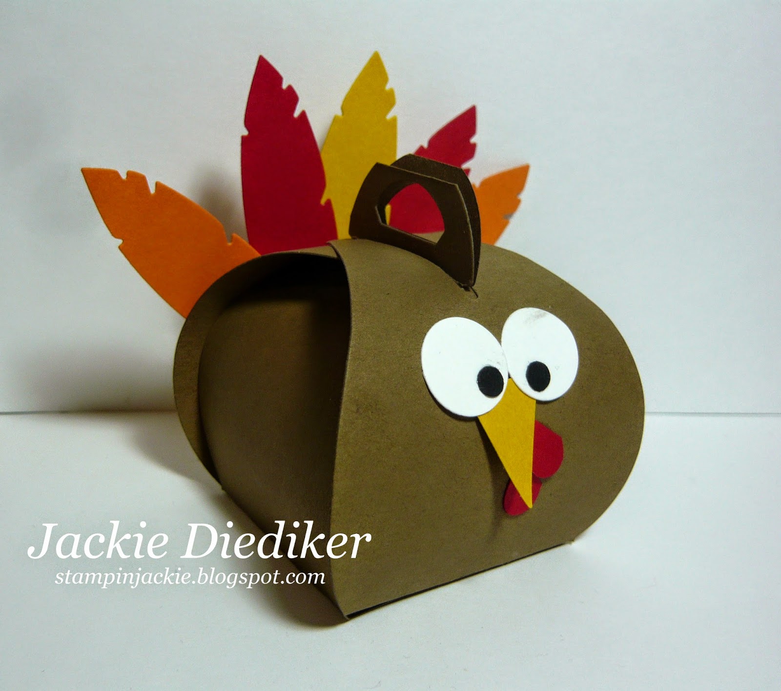 I didn’t stop there for today’s hop. While I have shared the Pumpkin boxes already to some people and at an event I haven’t shared this next one…my version of a Turkey using the Curvy Keepsake Die! I used the Curvy Keepsake Die for the body of my Turkey and of course I used the Feather Framelits to create his tail, but that’s only the beginning. I also used our 1/2″ Circle Punch for the eyes, the excess from some 1/8″ Hole Punch for the pupils, the top of our Tree Punch for the beak, plus the Heart Punch from the Itty Bitty Accents Punch Pack cut in half for the snoods. Isn’t he just darling!